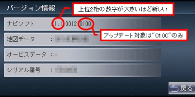 - 対象製品:ナビソフトバージョン *.*.****.0100(下4桁が"0100"以外は対象外)