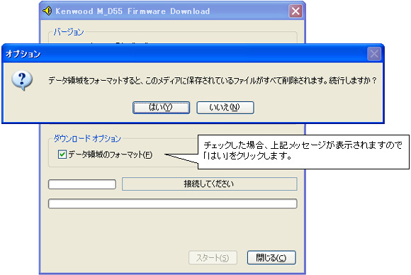フォーマットをする場合には「データ領域のフォーマット」欄にチェックを入れます。その場合、保存されている音楽データ等は消去されますのでご注意下さい。フォーマットしない場合はチェックしないで下さい。