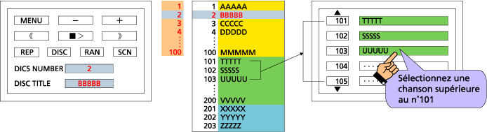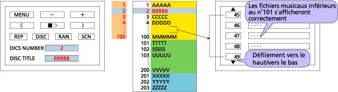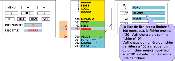Quand un fichier musical au dessus du n°101 est sélectionné, le chiffre des centaines n'apparaitra pas sur l'affichage |