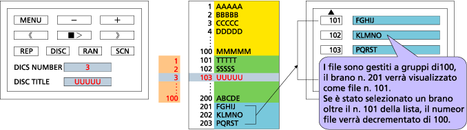 Quando il brano al di sopra del n. 101 è stato selezionato, il n. file visualizzato sul display sarà decrementato di 100. |