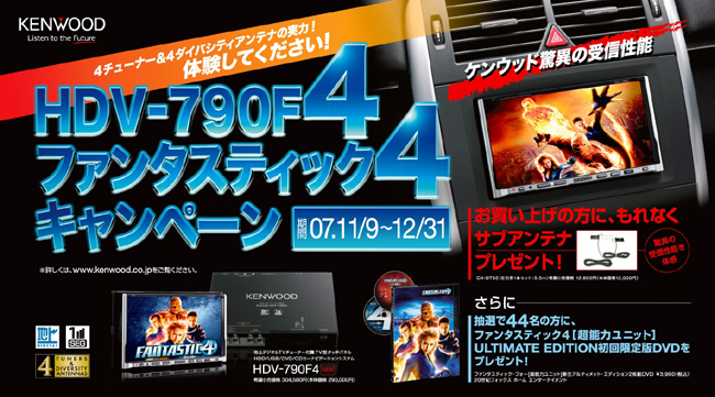 | 今回の「HDV-790F4 ファンタスティック4キャンペーン」では、期間中に地上デジタルTVチューナー付属HDDナビ「HDV-790F4」をお買い上げいただいた方にもれなく地上デジタルTV用アンテナ「CX-DT55」をプレゼント。さらに、人気映画ファンタスティック4[超能力ユニット]新生アルティメットエディションのDVDを抽選で44名様にプレゼントします。 |