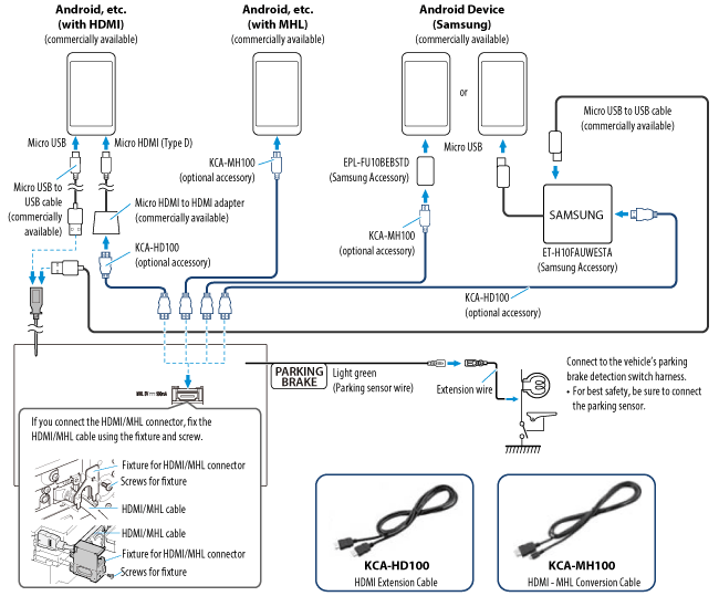 Optional HDMI-MHL Conversion Cable (KCA-MH100 : sold separately) or HDMI Extension Cable (KCA-HD100 : sold separately) is required, in order to connect to the Multimedia Receiver.