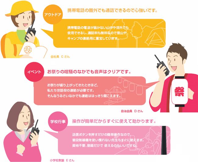 資格不要、手軽でパワフルにコミュニケーション。Hyper Demitoss(ハイパーデミトス)誕生。登録制度に対応したUHFデジタル簡易無線機TPZ-D503は、簡単な申請手続きで無線局が開設できる上、通信相手の制限がないため、誰とでも気軽に使用できます。たとえば自治会の催しや学校の行事といった業務上での使用はもちろん、登山やキャンプなどのアウトドアスポーツ/レジャーにも大活躍します。