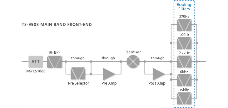 A key point in tapping maximum performance from the 1st mixer in actual operation (say, CW operation) is to prevent the outflow of unnecessary signals, other than the target signal, from the mixer to the subsequent stage. This is because it can tap the maximum performance of the digital IF filter using the DSP in the final IF stage. The TS-990S main receiver employs a 1st IF frequency 8.248 MHz down-conversion format. It achieves superior close-in dynamic range unattainable through conventional up-conversion formats. Even if the interference is a close-in frequency, the receiver maintains a relatively flat dynamic range, which you can tune without losing your target signal.