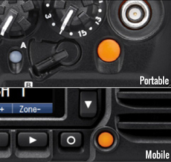 The bright orange Emergency Button is located at the top (portables) or front (mobiles) of the radio for high visibility and instant access when needed.