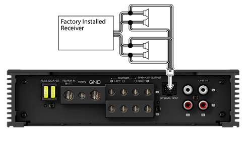 Speaker Level Input Harness is included to connect to speaker wires from factory installed receivers.