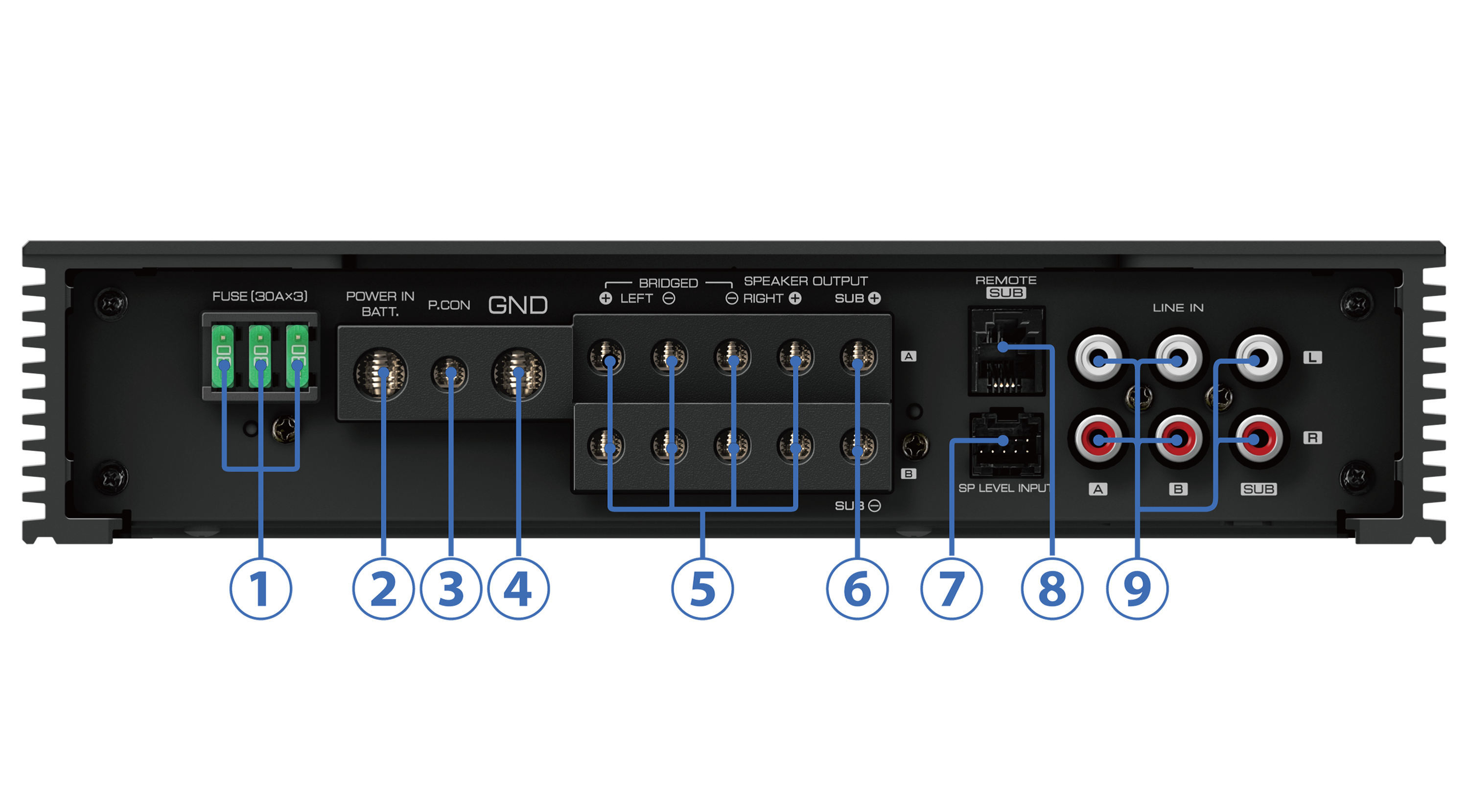 | Key Features | Hi-Res AUDIO Compliant CTA-2006-D Compliant Class D 2 Ohms Load Capability One-Sided Connection Speaker Level Input Signal Sensing Turn-on Remote Level Control ※Input Sensitivity for Sub Terminal Concealing Cover(Resin Mold) Power MOS-FET Switching Power Supply Extruded Aluminum Heat Sink Design A B Sub Independent Gain Adjustment A B AB(Mix) Independent Gain Adjustment |