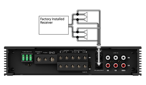 Speaker Level Input Harness is included to connect to speaker wires from factory installed receivers.