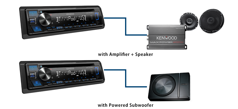 The KENWOOD receiver has RCA outputs to expand the system to connect to an additional amplifier or powered subwoofer.