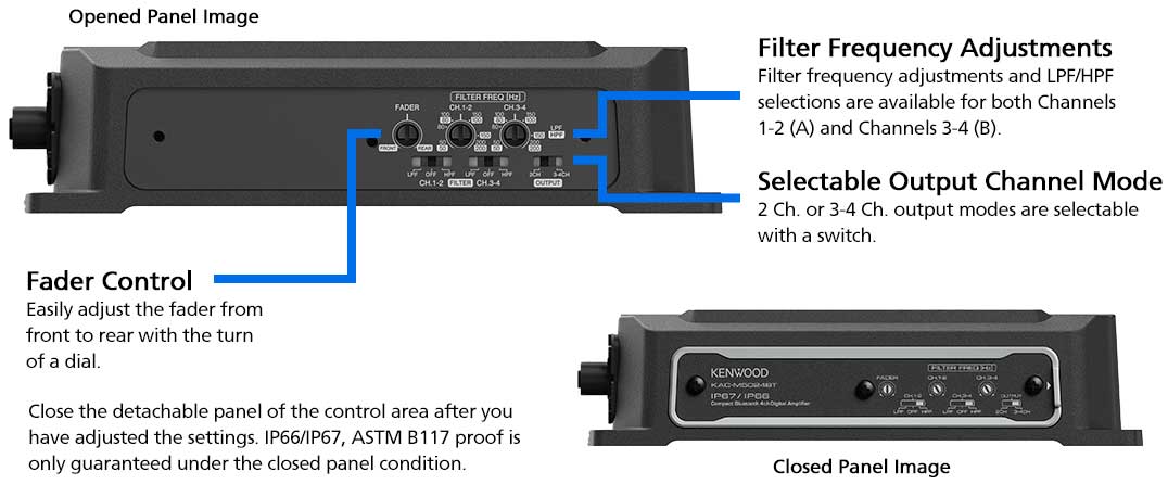IPX7/IPX6/IP6X certified. The amplifier can be submerged in up to 3.3 feet of water for 30 minutes, and can resist high-pressure, heavy sprays of water.