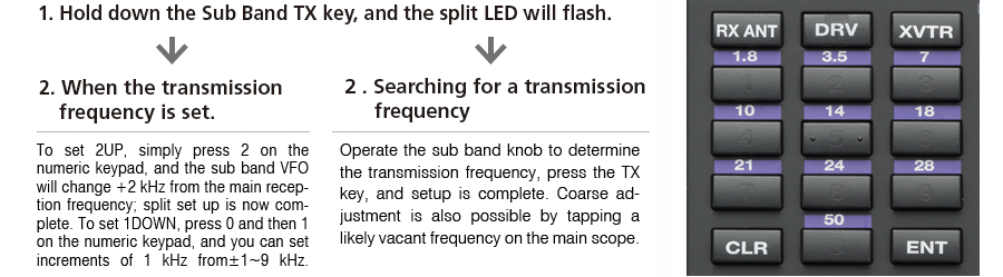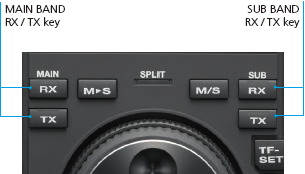 You can use the frequency function that switches legacy VFO A/VFO B by switching the main and sub band. Turn the sub band reception on and off using the RX key on top of the main knob, and switch between simplex and split using the TX key. A single glance at the LED lighting lets you know the current status.