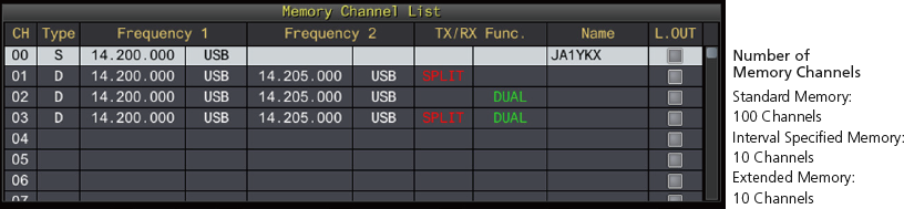 Memory for a maximum of 120 channels is available. In addition to the repeater frequency, you can also preset beacons and transmission stations. You can easily call up the states of simultaneous dual reception using the dual channel memory.