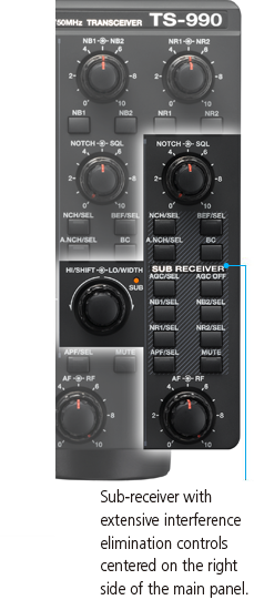 The dedicated sub-receiver has extensive interference elimination capability and is conveniently located to the right side of the main panel. Access the knobs and keys you need without hesitation. Share the use of main and sub band variable encoders by switching the operations object. An LED is lit when operating the sub band to prevent accidental operation (this can also be dedicated to the main encoder variable bandwidth). Other functions have been significantly upgraded in the TS-990S from the TS-590S, including band elimination filters, APF, mute, the addition of slope switching in theDSP IF FILTER, independent AGC OFF key, and simultaneous use of NB1/NB2.