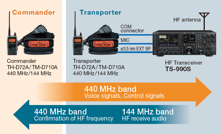 Enables full-duplex operation with improved functionality such as visual confirmation of HF frequency on the LCD panel. Control via TNC (AX.25) enables more access to HF functions: XIT, mode switching, split-frequency operations on/off, memory shift, and frequency step selection. The transporter sends out its pre-programmed call sign via CW every 10 minutes.