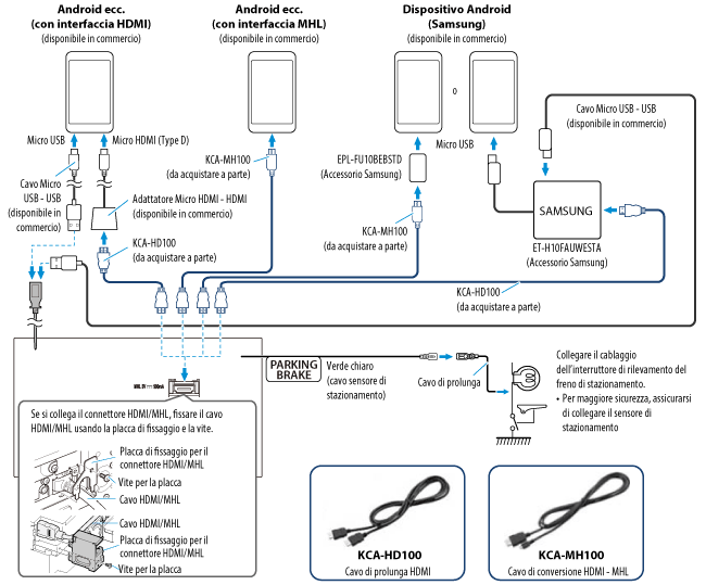 È necessario un cavo di conversione HDMI-MHL opzionale (KCA-MH100: venduto separatamente) o una prolunga HDMI (KCA-HD100: venduta separatamente) per collegarsi al ricevitore multimediale.