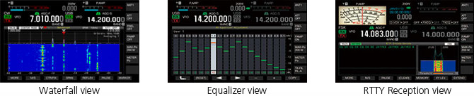 主显示屏显示关于频率、模式、仪表和其他功能的基本信息,以及其他辅助功能的开/关状态。 您还可以查看内部参数设置和内存列表。 此外,它还具有频段范围功能,可以让您监控频段状态。 使用 DSP 执行快速扫描与 FFT 处理。 切换至不同的视图模式,例如瀑布流视图及接收/传输均衡器视图。