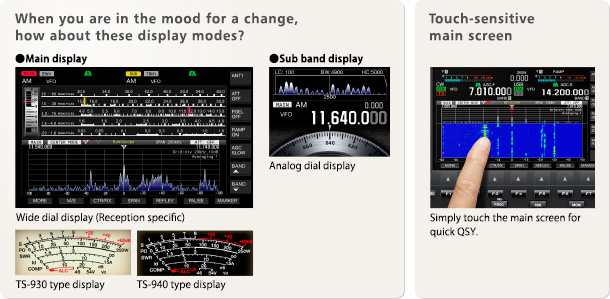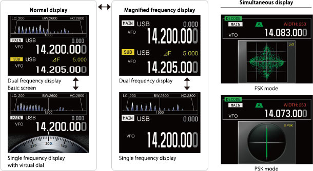 3.5 英寸 TFT 副频段显示屏位于主旋钮上面,这不仅减少了阅读频率时的眼部运动,也通过显示解调的音频频谱让您可以监视目标信号本身。 此外,滤镜效果可以显示在醒目的副频段显示器上,让您可以进行直观的操作。 您可以根据您的目的,在以下四种不同的视图模式之间切换副频段显示屏。