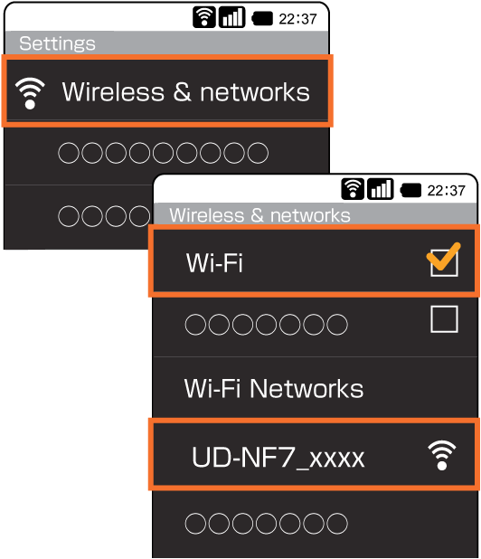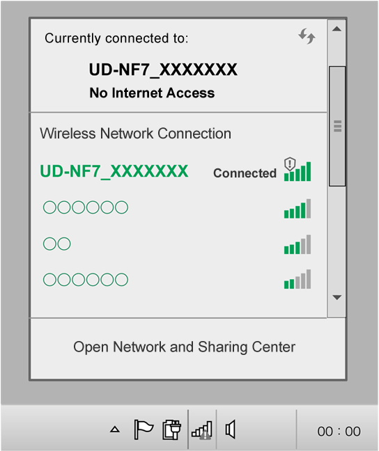 Open the screen for the wireless LAN network setup, and then select "UD-NF7_xxxxxx".