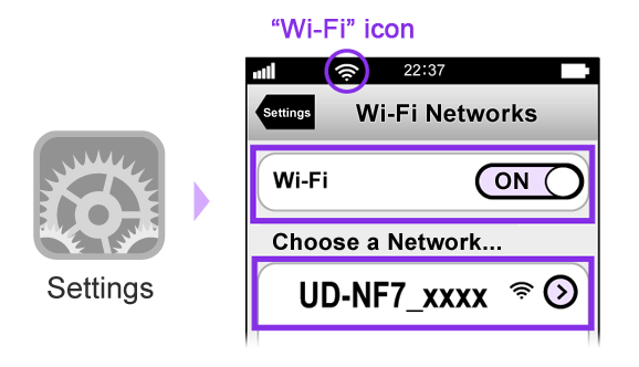 Set the "Wi-Fi" to "ON" if it is "OFF", and then select "UD-NF7_xxxxxx". Wait for about 1 to 2 minutes until the "Wi-Fi" icon is displayed on the upper left of the screen.
