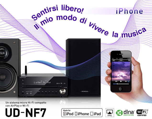 UD-NF7 supporta AirPlay, permettendoti lo streaming della musica della tua libreria per un ascolto wireless da dispositivi come iPhone, iPod touch, iPad o il tuo PC. AirPlay ti permette di controllare liberamente la musica sul tuo iPhone, così come la libreria iTunes del tuo PC dal tuo iPhone.