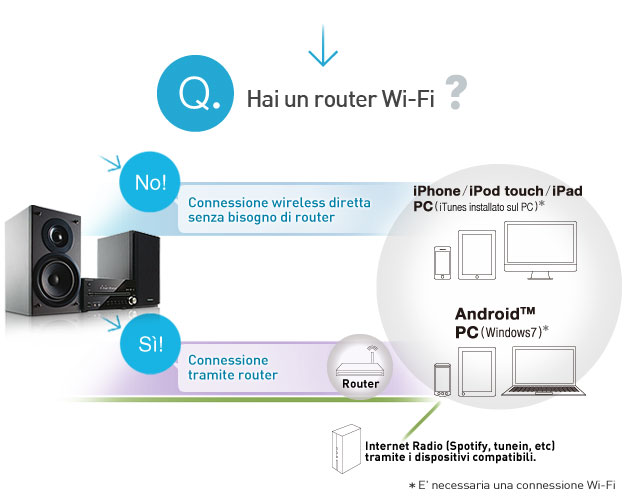 Connettendo un router è anche possibile riprodurre musica da Internet Radio (Spotify, tunein, etc) attraverso dispositivi compatibili. UD-NF7 supporta WPS (Wi-Fi Protected Setup™), consentendo una semplice impostazione della connessione con il router-