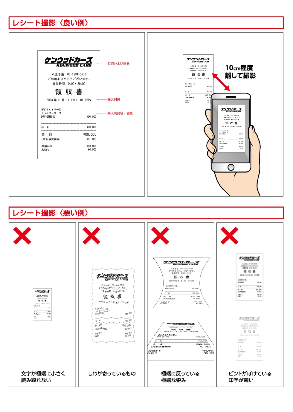※購入日と納品日の2つが記載されている購入証明書類でご応募いただいた場合は購入日でご応募内容の判断をさせていただきます。 ※応募書類に一点でも不備がある場合は無効とさせていただきます。 ※キャンペーン応募の為の領収書には、収入印紙は不要です。 ※対象商品の「納品書、販売証明書、レシート、お買い上げ明細書、領収書、請求書、取付作業伝票」と、「保証書」のコピーを撮影した場合は、無効となります。 ※購入証明書類に記載があっても製品登録と応募製品登録が無い場合は無効または金額加算の対象外とさせていただきます。