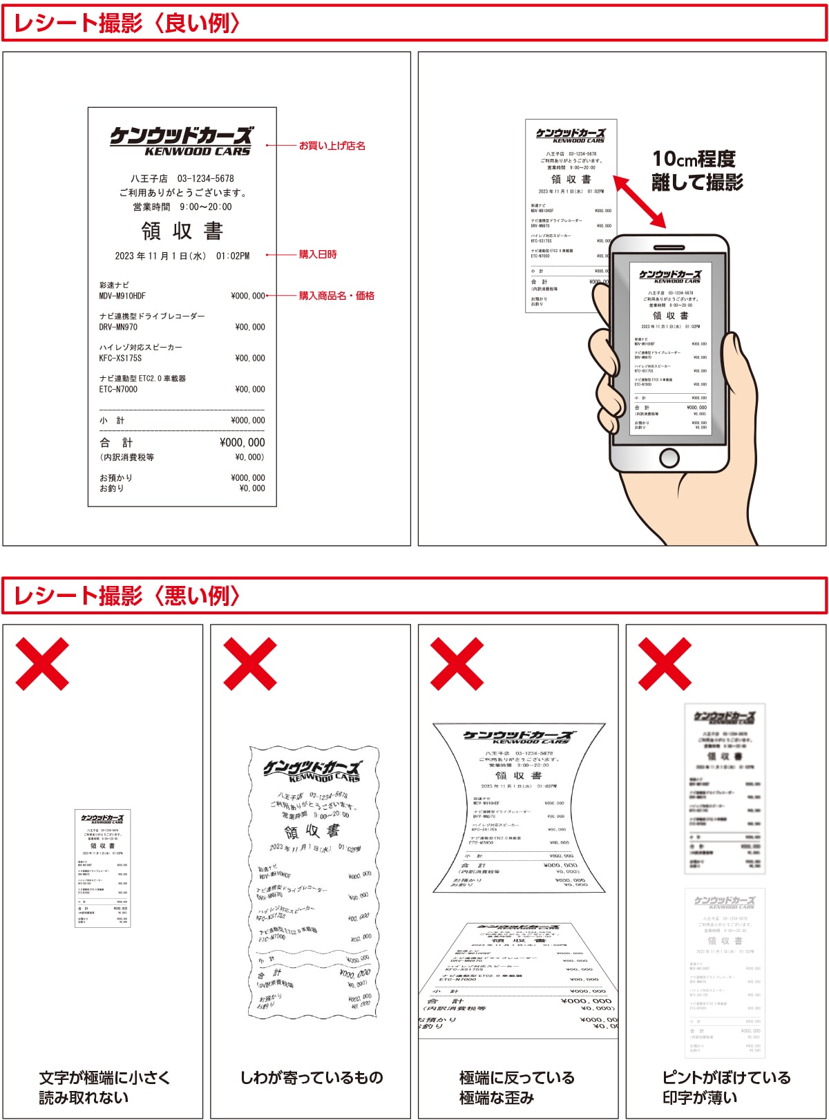 ※購入日と納品日の2つが記載されている購入証明書類でご応募いただいた場合は購入日でご応募内容の判断をさせていただきます。 ※応募書類に一点でも不備がある場合は無効とさせていただきます。 ※キャンペーン応募の為の領収書には、収入印紙は不要です。 ※ハイレゾ対応スピーカー(KFC-XS175S/XS165S)には保証書がありませんので、保証書のコピーの添付は必要ありません。 ※彩速ナビ、ナビ連動型ETC2.0車載器、HDリアビュー/マルチビュー/スタンダードリアビューカメラの保証書は商品に付属の取扱説明書に記載されています。この保証書のみ製造番号が非記載でもご応募いただけます。 ※対象商品の「納品書、販売証明書、レシート、お買い上げ明細書、領収書、請求書、取付作業伝票」と、「保証書」を撮影した場合は、無効となります。 ※購入証明書類に記載があっても製品登録と応募製品登録が無い場合は無効または金額加算の対象外とさせていただきます。