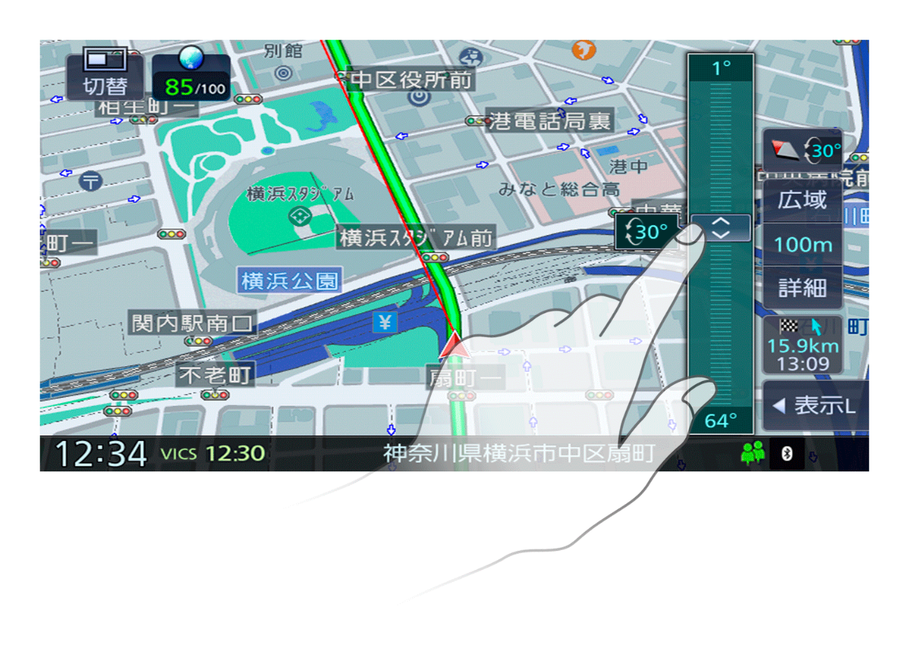 ドライビング3Dマップ表示時に、方位ボタンを長押しすると「3Dスライダー」が表示されます。
