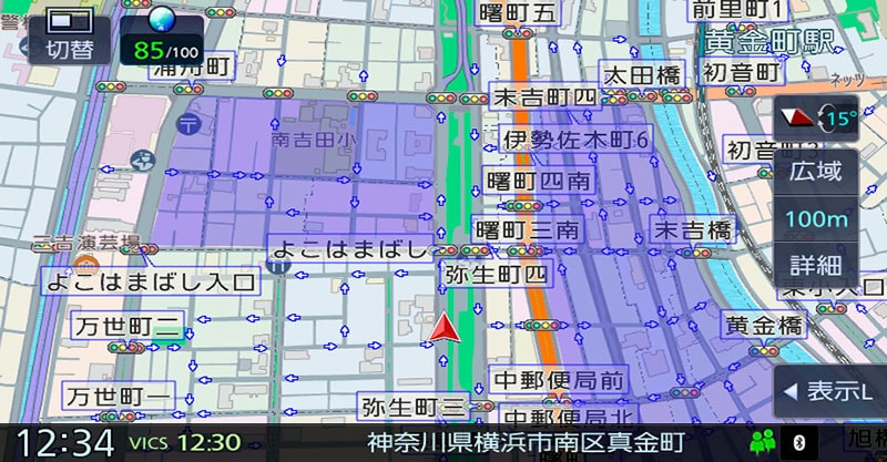 ゾーン30エリアとは、歩行者や自転車の安全な通行を確保するために、時速30キロの速度規制を実施しているエリア(区域)のことです。縮尺が300m以下のときに地図上に青紫色で表示されます。非表示設定も可能です。
