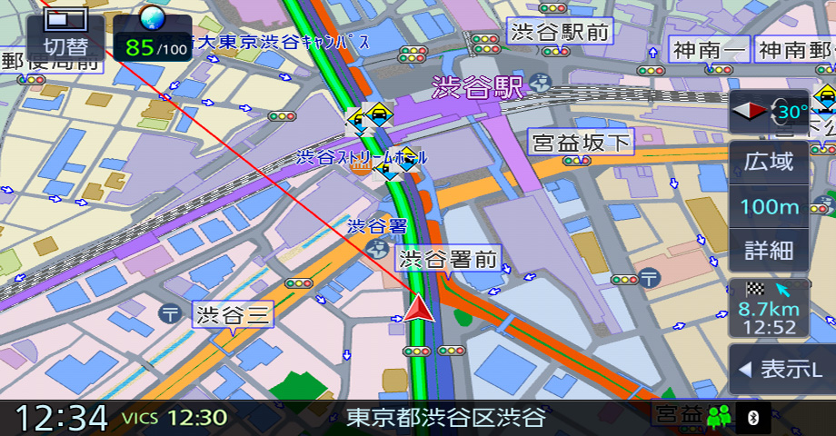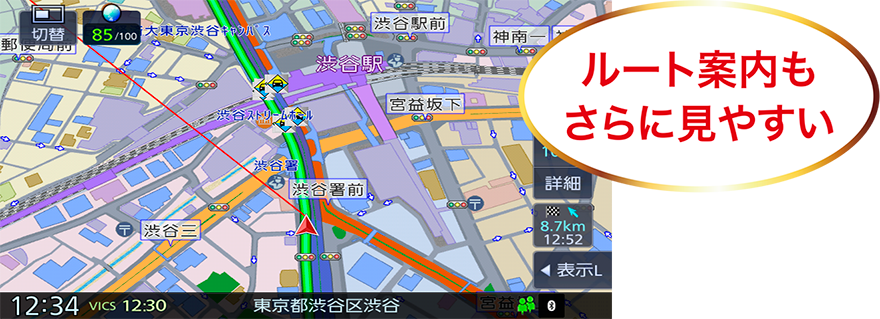 新たに搭載された地図色「スマートカラー(地図色1)」は、欲しい情報がスマートに目に入ってくるように、色味や彩度を徹底的に調整。さらに、文字と背景の重複を避けて配色・コントラストを最適化。洗練された地図描画が、より安心で快適なドライブをサポートします。