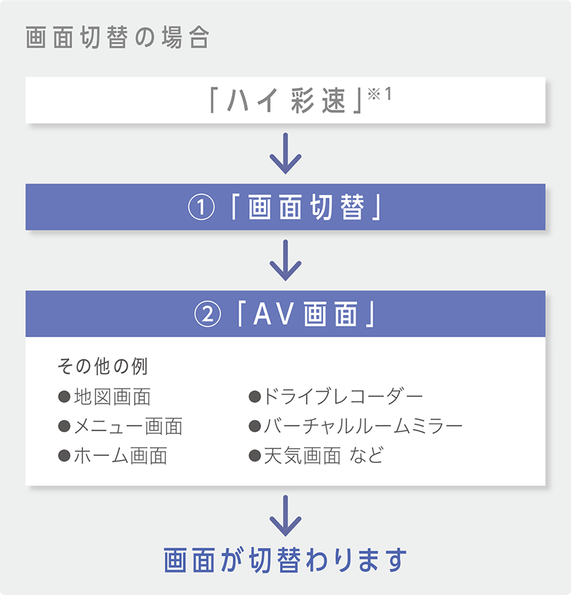 ※2:【MENU】ボタンの長押し、もしくはステアリングリモコンに起動ボタンを割り振ることで、「ハイ彩速」の発話をスキップ可能です。