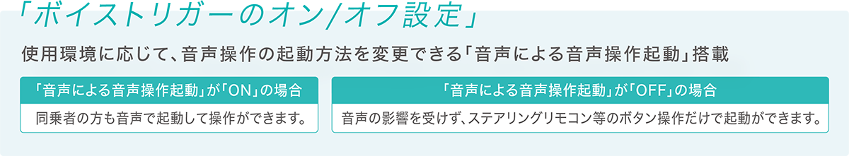 ※1:使用環境に応じて、音声操作の起動方法を変更できる「ボイストリガーのオン/オフ設定」を搭載しています。