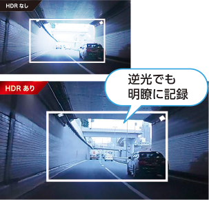 逆光や夜間走行時の街灯、トンネルの出入り口など明暗差が激しい環境時におきる「白とび」や「黒つぶれ」を抑え明瞭な映像を記録します。