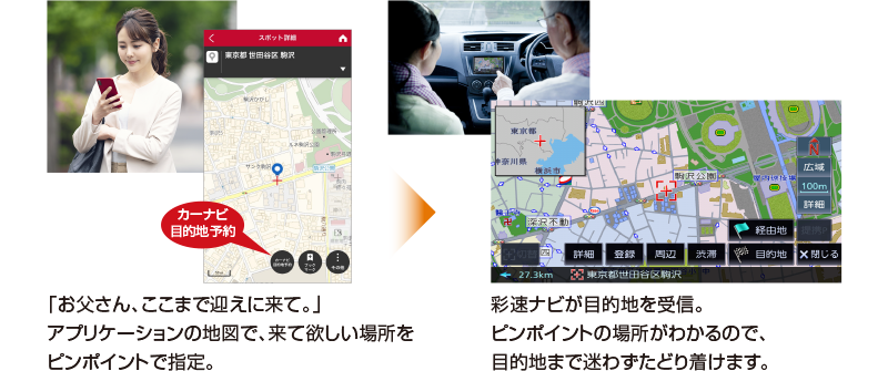 クルマで迎えに来て欲しい時、正確な場所を伝えるのは大変です。 「MapFanAssist」アプリケーションからピンポイントで目的地を彩速ナビに送信すれば、 正確な場所を伝えることができます。