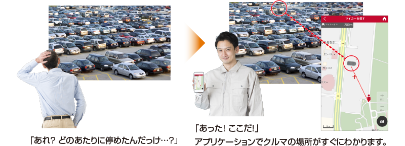 クルマの外からでも、クルマの現在位置が地図で確認できます。 広大な駐車場に停めたクルマの位置もスマートフォンの地図ですぐに確認できるので、安心です。