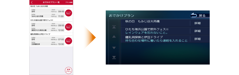 クルマでの旅行など複数のスポットを回る時は、 MapFanの「おでかけプラン」で詳細な予定を組み立てることができます。 作成したドライブ計画は彩速ナビに転送することができます。