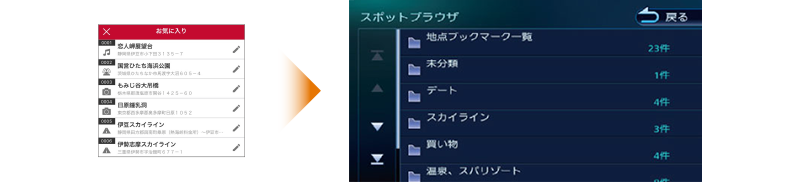 いつか行きたい場所をMapFanのブックマークにどんどん登録しておけば、 登録した場所は彩速ナビの「スポットブラウザ」からいつでも呼び出せるので目的地設定も楽々です。