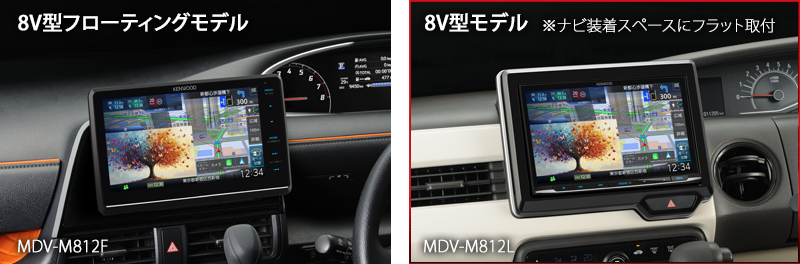 彩速ナビ大画面8V型に2モデルをラインアップ。新車はもちろん、多くの既販車にも取付けできるフローティング機構を採用したMDV-M812F。人気のトヨタ車のナビ装着スペースへぴったりフラットに取付けできるMDV-M812L。大画面ならではの広範囲で見やすい地図、臨場感あふれる大迫力の映像美、優れた操作感をご体感ください。