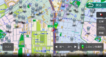 「名称」「住所」「電話・郵便番号」「ジャンル」「履歴」「登録地点」などから目的地検索が可能。画面に触れずに目的地が探せる音声検索にも対応しています。ガソリンスタンドやコンビニなどを探すときに便利な「ピンドロップ検索」は、自車周辺の検索結果をピンのかたちで地図上に表示し、そのピンをタッチすると目的地に設定できます。