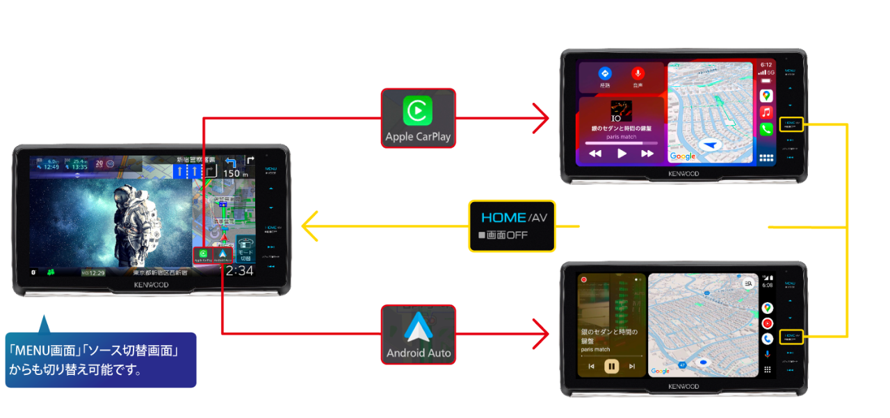 本機のHOME画面、MENU画面、またはソース切替画面から「Apple CarPlay」「Android Auto」の画面にワンタッチで切り替え可能。