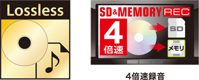 CDを内蔵メモリまたはSDカードへ、より高音質で記録できる「高音質ロスレス録音」を採用しました。音楽データを欠落させずに圧縮し録音、再生時には圧縮前の状態に戻す「可逆圧縮」方式で、より高音質な再生を実現します。録音音質は標準(128kbps)、高音質(256kbps)、ロスレスを選択できます。また、録音は4倍速の高速録音に対応しています。