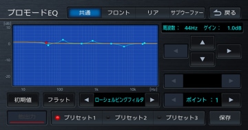 車室内には、音を反射するガラス、音を吸収するシートなどがあり、高音質再生のためには音響特性をフラットに近づける必要があります。「プロモードEQ」は、視聴位置やスピーカー位置などのポイントに合わせて周波数レベルや周波数帯域を細やかに調整し、車室内を高音質再生のベースとなる最適な特性に整えることが可能です。