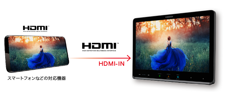 リアモニターをHDMI接続することでiPhoneの動画や地デジ・さまざまなメディアのHD動画をハイビジョン映像で見ることができます。