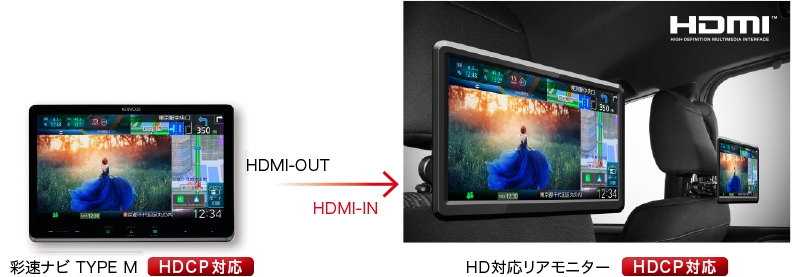 ナビで再生しているソースの映像をリアモニターでもHD画質で楽しめるHDMI出力に対応。