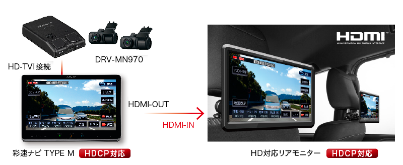 さらに、ナビ連携ドライブレコーダーをHD-TVI接続することで録画映像やライブ映像を後席でも鮮明に確認することができます。
