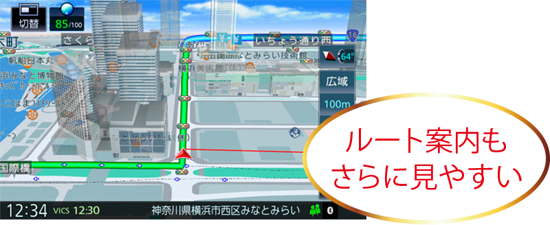 鳥瞰図の視点を5段階の調整と3Dポリゴンの透過処理によりビルの陰になる道路も確認できる「ドライビング3Dマップ」を搭載。