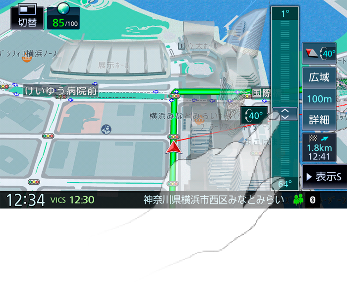 実際の道幅がわかりやすく、一方通行、交差点名、施設などの情報も表示されるので使いやすく、美しい地図表示を実現しています。