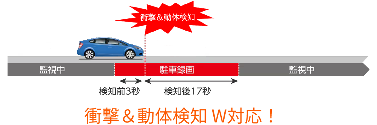 車載電源ケーブルCA-DR100(別売)の使用で最長24時間の衝撃およびレンズ範囲内の動体の監視が可能になります。衝撃や動体を検知すると検知前3秒、検知後17秒間録画保存します。