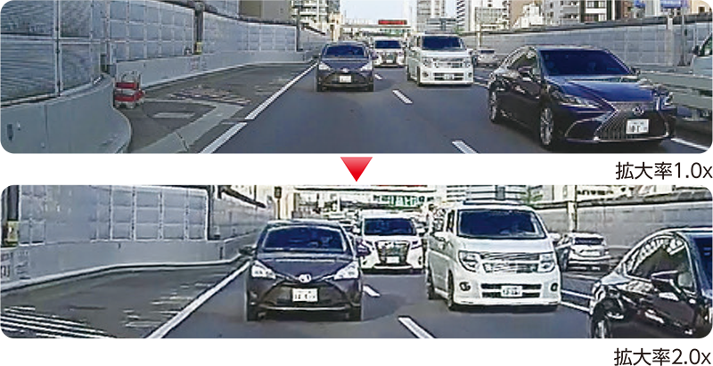 後方車との距離感がつかみにくい場合に、表示する映像を最大2倍まで6段階で拡大表示が可能です。
