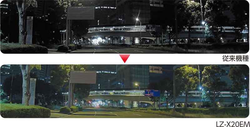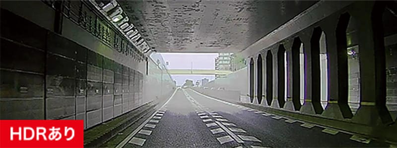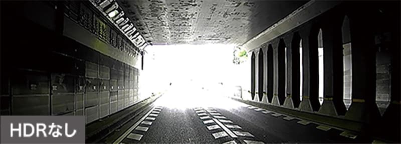 逆光や夜間走行時の街灯、トンネルの出入り口など明暗差が激しい環境時におきる「白とび」や「黒つぶれ」を抑え明瞭な映像を表示します。